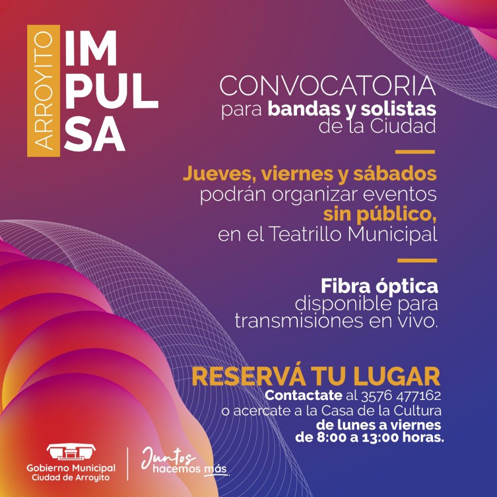La Coordinación de Eventos y Talleres, de la Secretaria de Educación y Cultura Municipal convoca a todas las bandas y solistas de la Ciudad a realizar actividades musicales de hasta 10 personas en el Teatrillo Municipal Francisco Guarch para ser trasmitidas en vivo y sin público.