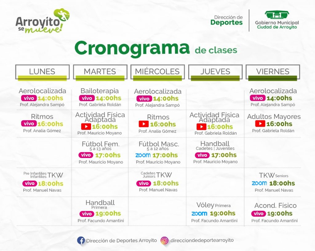 Dentro del gran abanico de propuestas la población podrá acceder a clases de Aerolocalizada, Ritmos, Taekwondo, Bailoterapia, Futbol Femenino, Futbol Masculino, Handball, Voley, Acondicionamiento Físico y Actividades para Adultos Mayores de manera gratuita a través de transmisiones en vivo desde las redes sociales de la Dirección de Deportes, videoconferencias mediante Zoom y videos en Youtube.