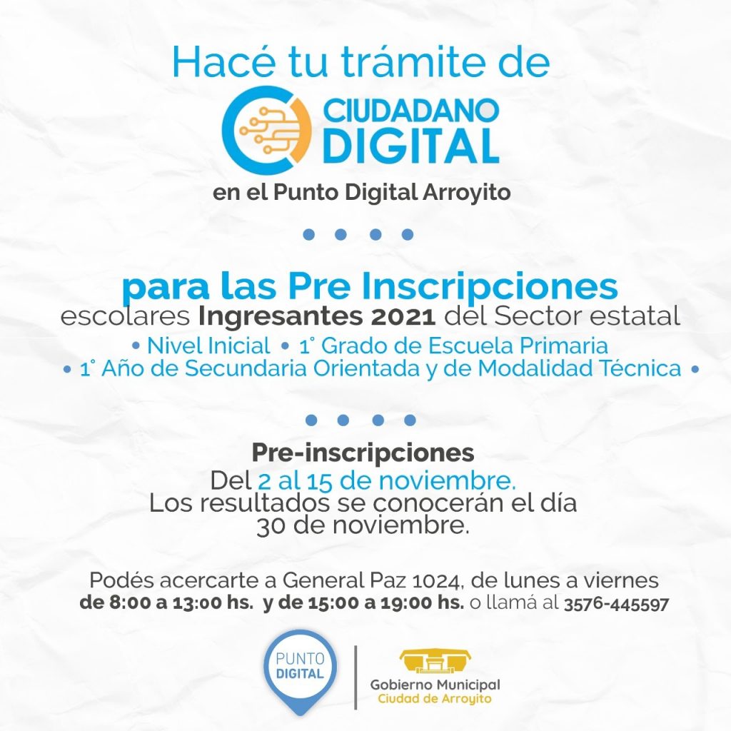 El Gobierno Municipal informa que el Punto Digital Arroyito, amplía su horario de atención para dar ayuda a los ciudadanos con las Inscripciones Escolares para Institutos Públicos. El horario de atención será de 8:00 a 13:00 horas por la mañana y de 15:00 a 19:00 horas por la tarde.