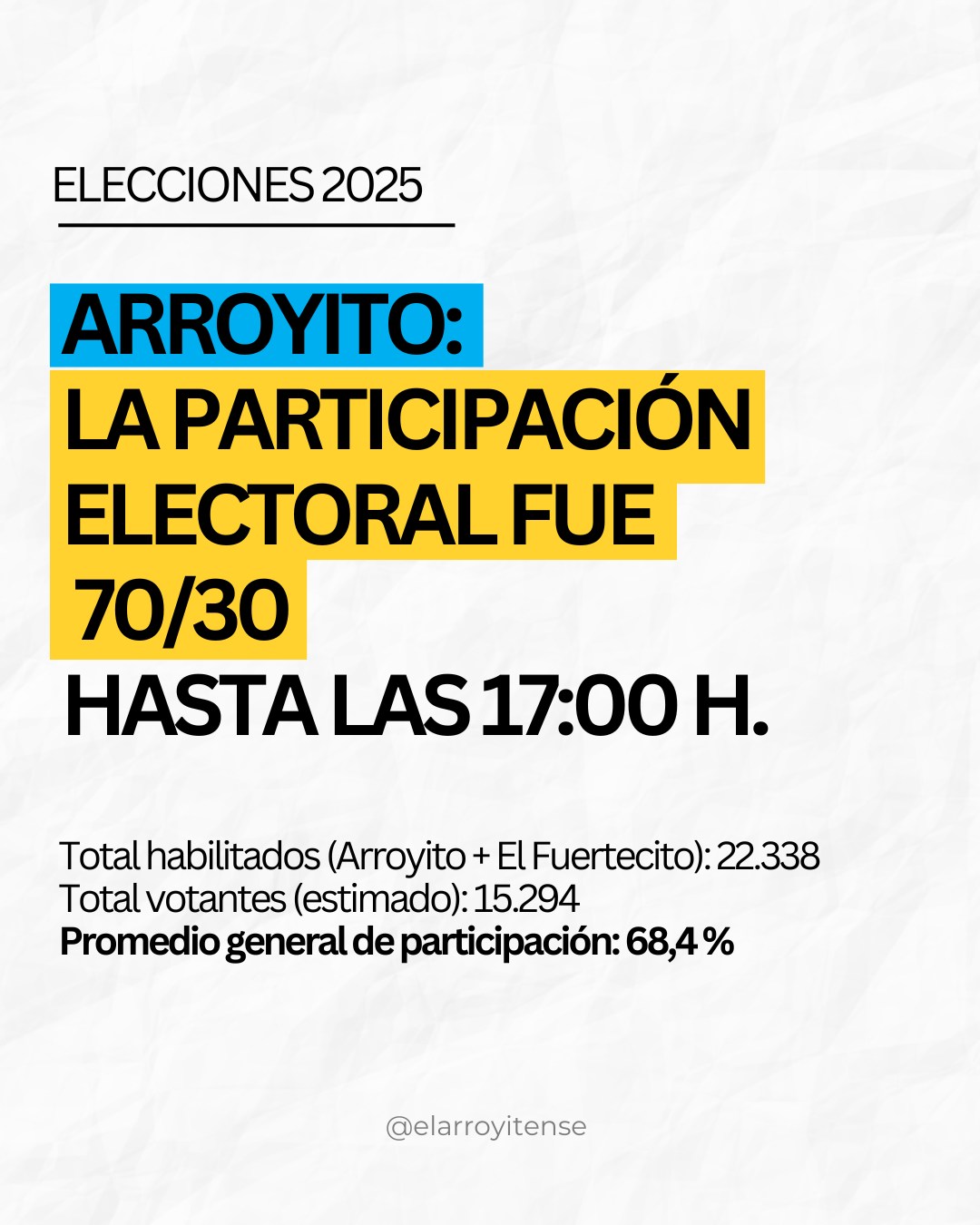 Este domingo 26 de octubre de 2025, la participación electoral en la ciudad de Arroyito y en el Paraje El Fuertecito alcanzó una proporción estimada de 70/30, con un promedio general del 68,4 % hasta las 17:00 h.