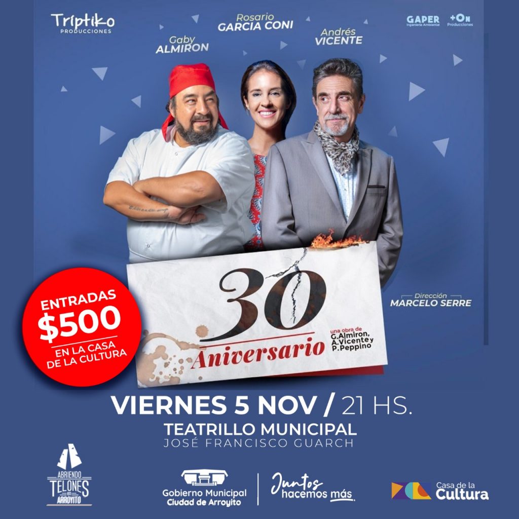 El Intendente Municipal Gustavo Benedetti y la Secretaría de Educación y Cultura, invitan a toda la población a participar de la Obra 30 Aniversario, que llegará a la ciudad el viernes 5 de noviembre, en el Teatrillo Municipal José Francisco Guarch a las 20:30 horas.