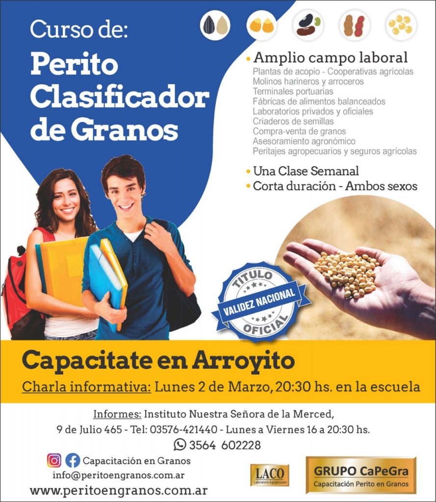 El grupo capegra con el auspicio de Laco laboratorio agropecuario ofrece la carrera de perito clasificador de cereales oleaginosas y legumbres. el perito en granos es un profesional ya que es la única persona autorizada dentro del mercado granario argentino que puede certificar calidad de granos.