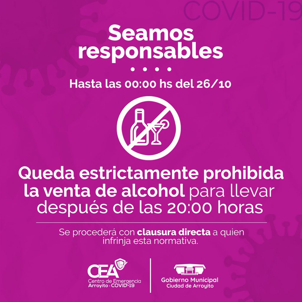 El Gobierno Municipal de la ciudad de Arroyito, dispuso con el objetivo de evitar las reuniones sociales clandestinas y la circulación indebida por la noche, la suspensión de venta de bebida alcohólica para llevar desde las 20:00 horas. La medida tiene vigencia hasta las 00:00hs del 26/10/2020.