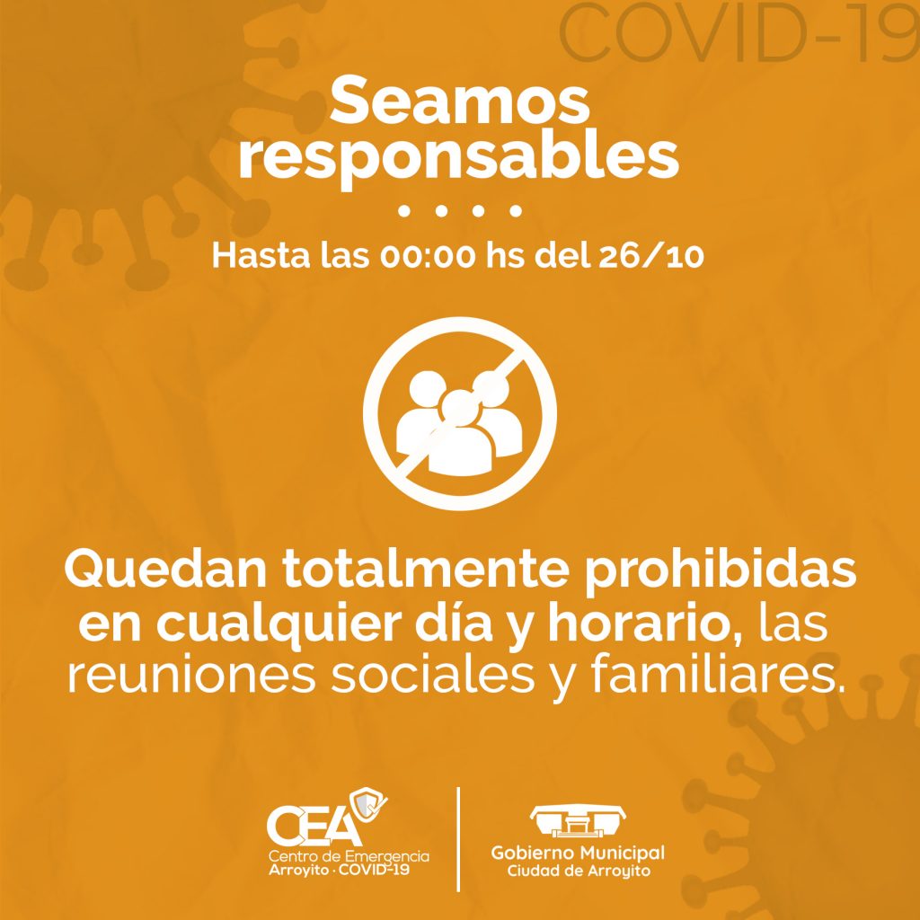 Además, recordamos a la población que están totalmente prohibidas en cualquier día y horario, la realización de reuniones sociales y familiares.