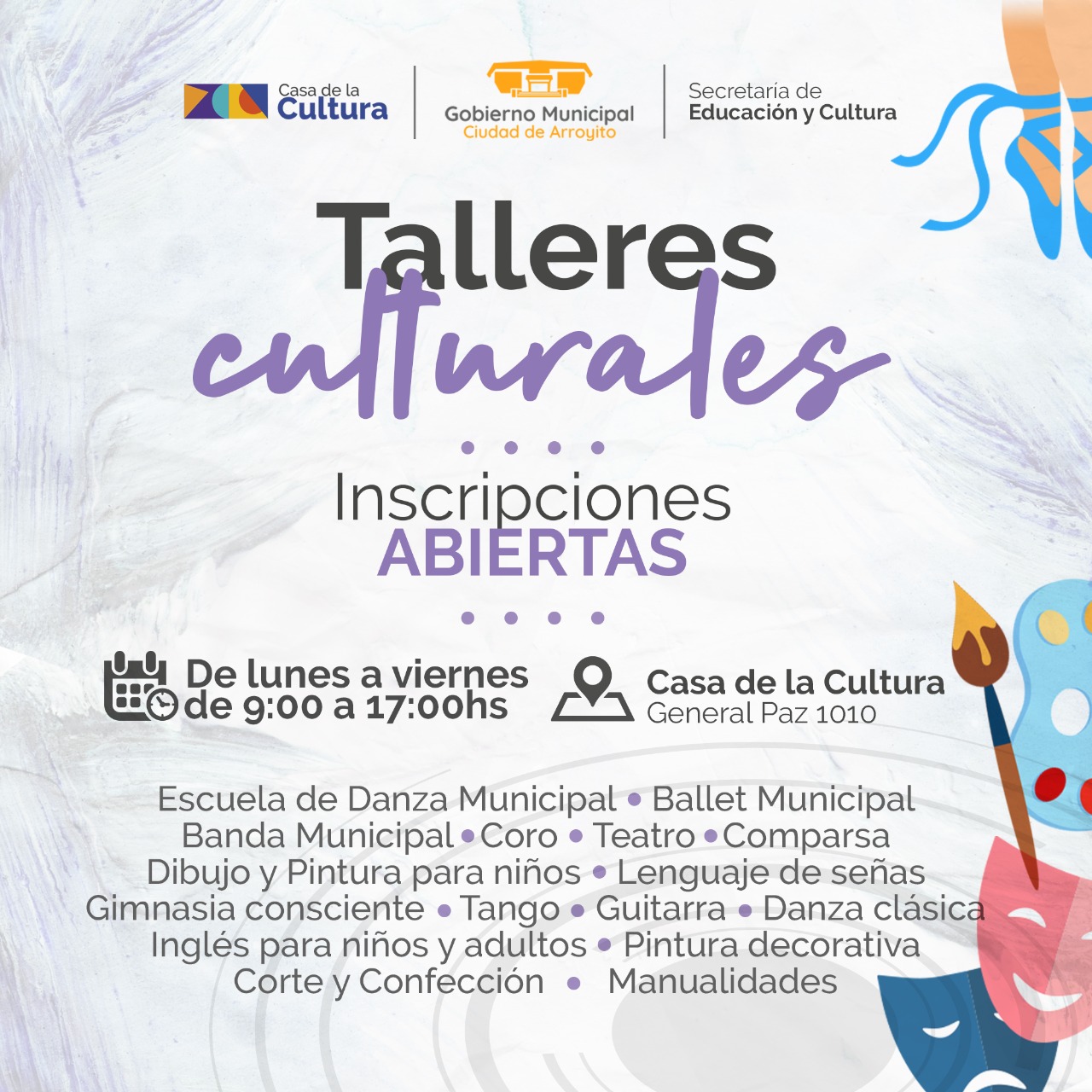 El Gobierno Municipal, a través de la Secretaría de Educación y Cultura, comunica que ya están abiertas las inscripciones para una variadísima oferta de Talleres Culturales, que comenzarán a dictarse en abril, con las medidas de bioseguridad correspondientes.