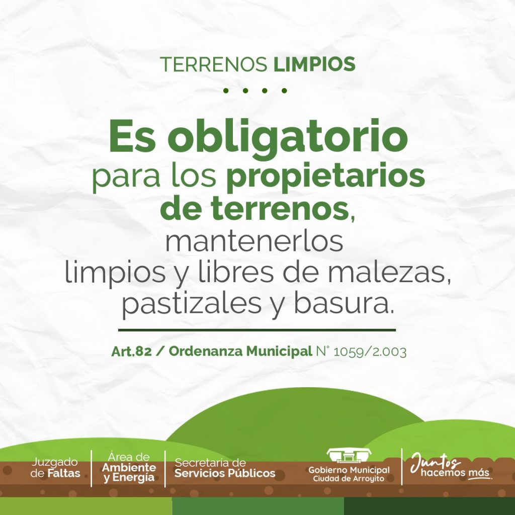 El Juzgado de Faltas, la Secretaría de Servicios Públicos, y el Área de Ambiente y Energía, informan a la población que los propietarios de terrenos o las personas que por cualquier causa lo detenten, exploten o lo tengan bajo su cuidado, están obligados a mantenerlos limpios y libres de malezas, pastizales y basura.