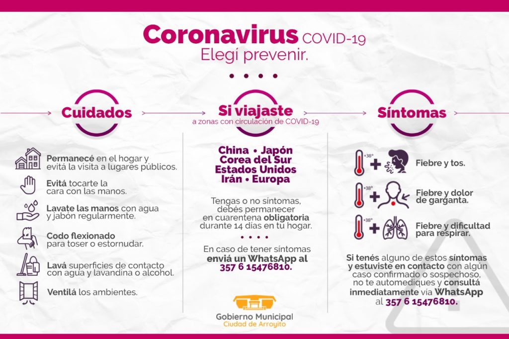 El Gobierno Municipal de la Ciudad de Arroyito, informa las siguientes Medidas Preventivas para evitar el contagio del Coronavirus (COVID-19).