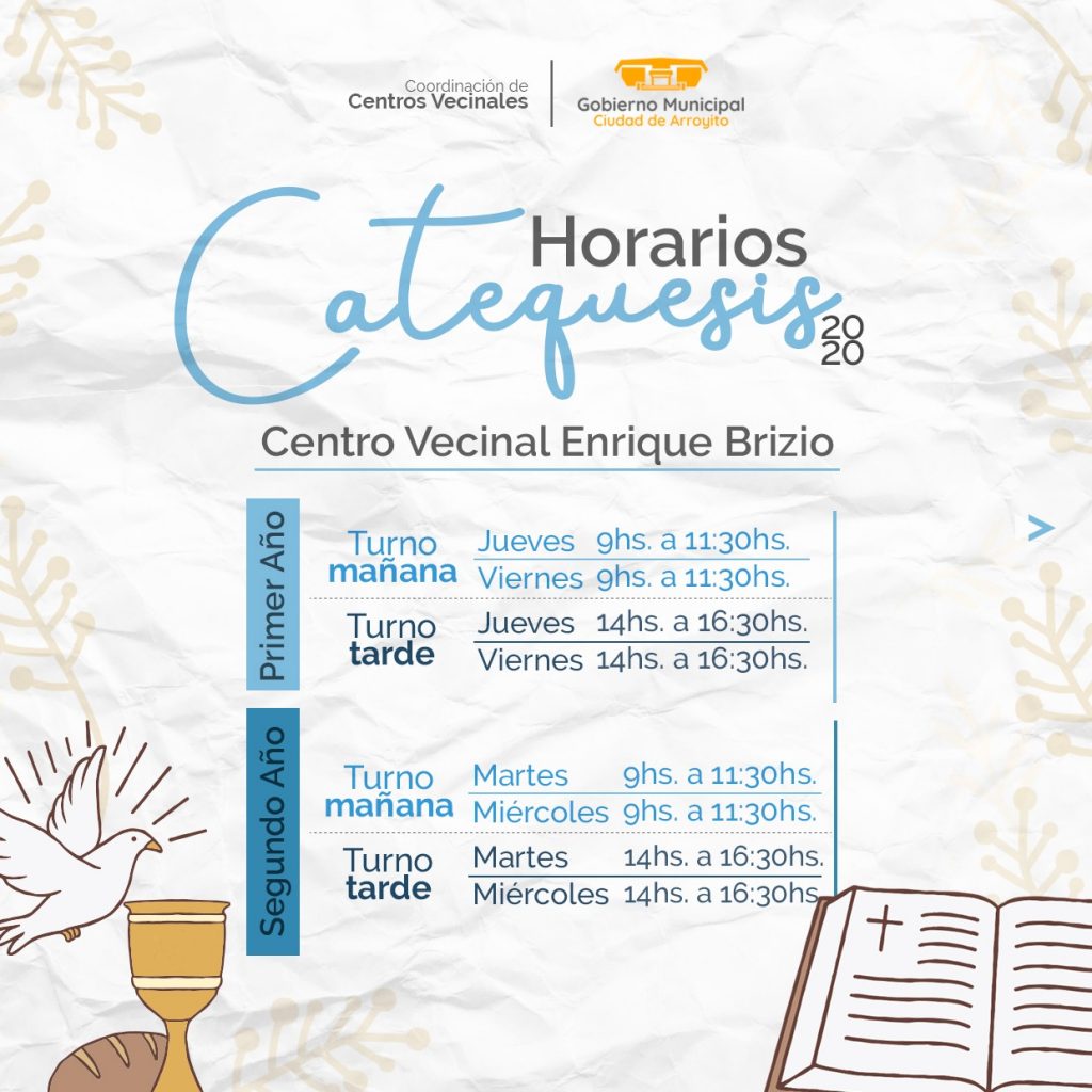 La Coordinación de Centros Vecinales del Gobierno Municipal comunica a toda la comunidad los días y horarios de Catequesis en