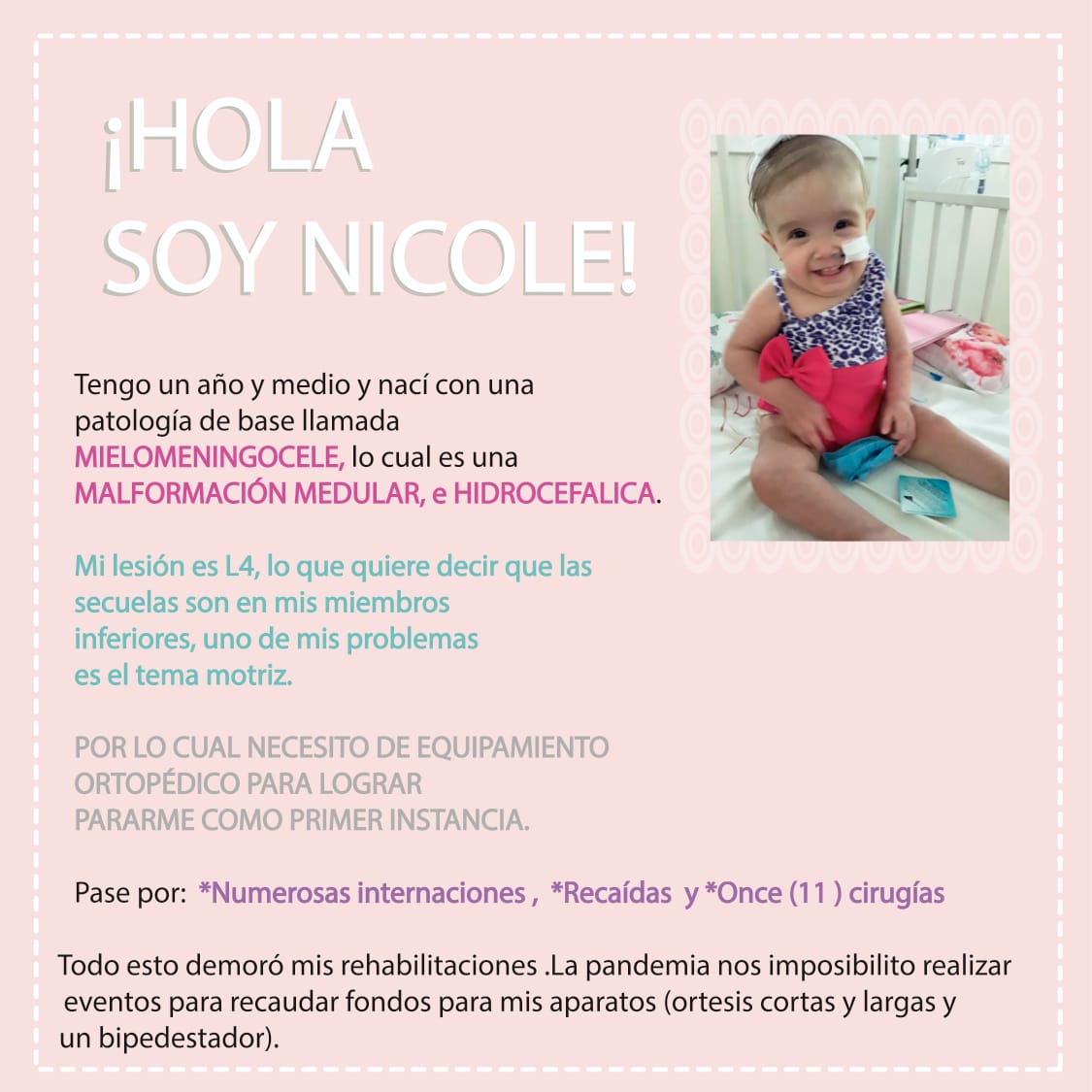 Nicole es una niña de un año y medio que nació con una patología de base llamada Mielomeningocele, lo cual, produce una malformación medular e hidrocefalica.