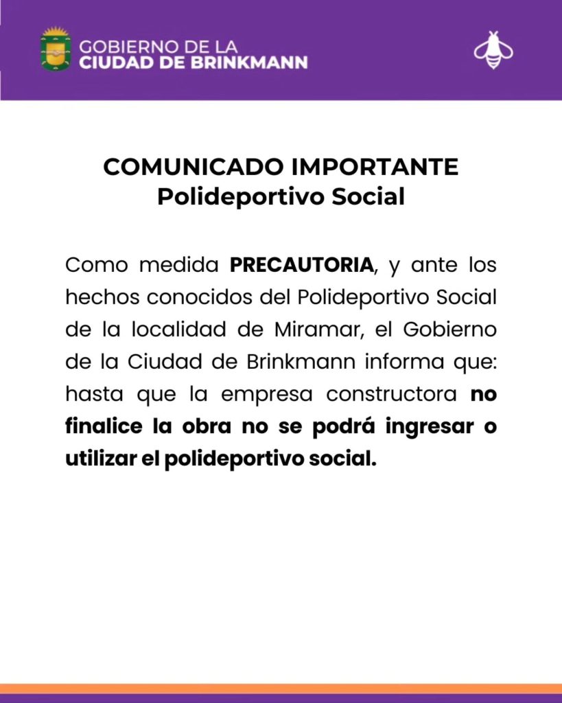 El Gobierno de la Ciudad de Brinkmann emitió un comunicado oficial en el que informa que, como medida precautoria, y a raíz de los hechos ocurridos en el Polideportivo Social de Miramar, quedará prohibido el ingreso y uso del Polideportivo Social local.