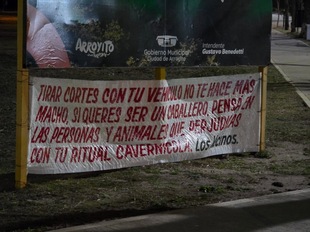 Cansados de los ruidos provocados por vehículos que realizan “cortes” de escape, vecinos colocaron un pasacalles en la esquina de
