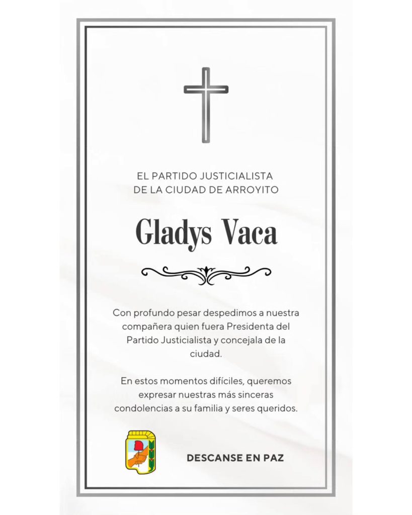 Con profundo pesar despedimos a nuestra compañera Gladys Vaca quien fuera Presidenta del Partido Justicialista y concejala de la ciudad.