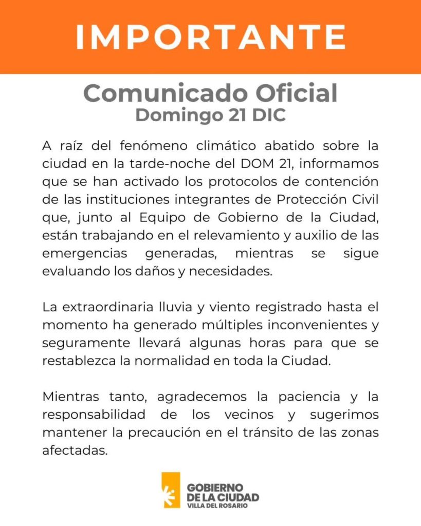 A raíz del fenómeno climático registrado en la tarde noche del domingo 21 de diciembre en Villa del Rosario, el