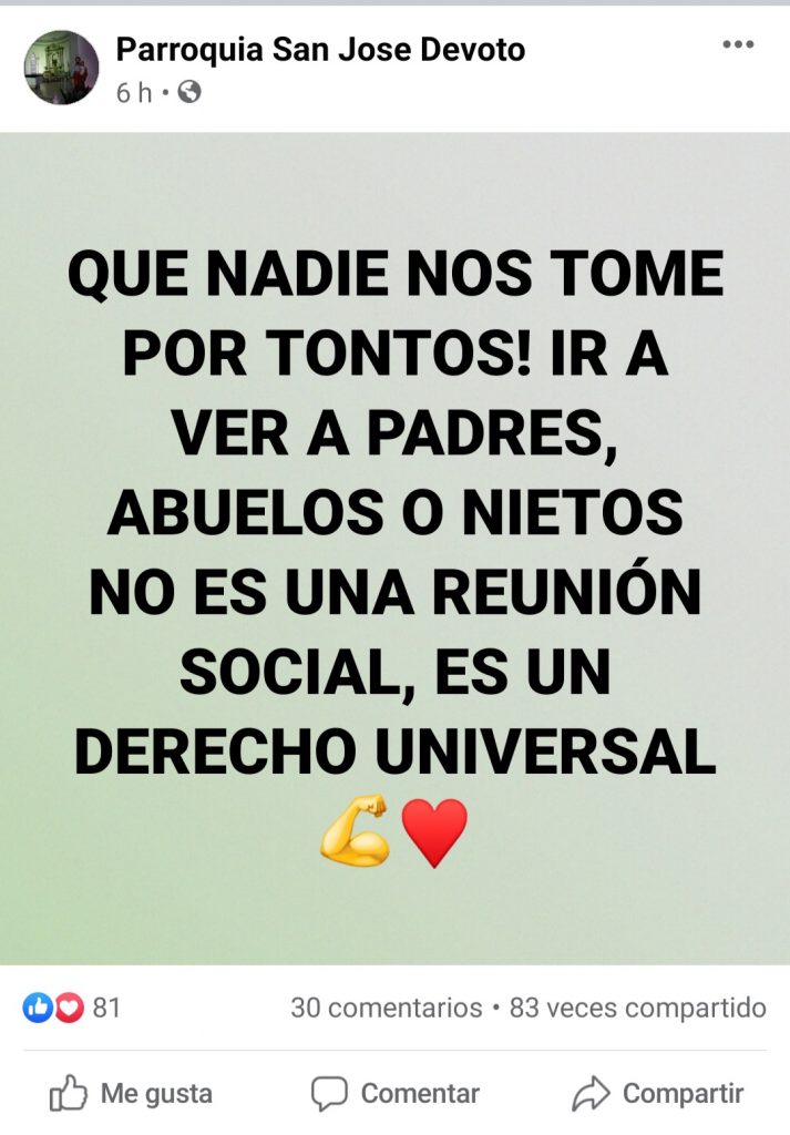 A través de la red social Facebook y de forma pública, la Parroquia San José de la localidad de Devoto lanzó un mensaje que en pocas horas se convirtió en viral siendo compartido más de 80 veces y con 30 comentarios.