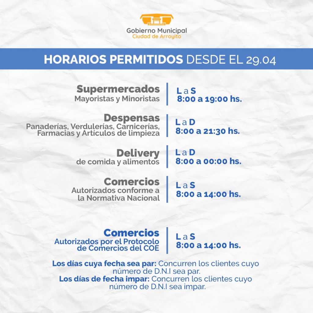 El Gobierno Municipal comunica a toda la población los nuevos horarios dispuestos por el Gobierno Provincial a través del COE y por el Ejecutivo Municipal mediante el Decreto N° 171-C/20 aprobado el día martes 28 de abril, durante el presente período de Aislamiento Social Preventivo y Obligatorio.