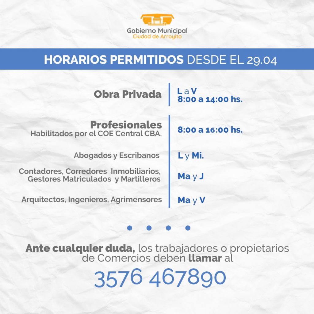 Los trabajadores de  Obras Privadas no habitadas, podrán trabajar de lunes a viernes de 08:00 a 14:00 horas. Siendo no más de 5 personas por Obra y solicitando el permiso Municipal correspondiente a la Dirección de Habilitaciones, Comercio y Bromatología.