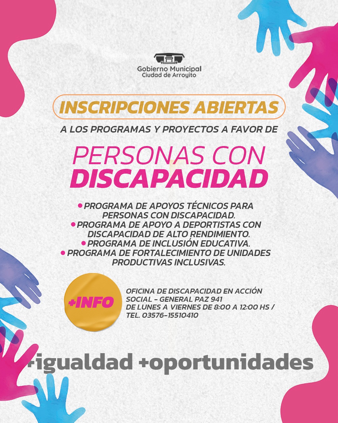 INSCRIPCIONES ABIERTAS A LOS PROGRAMAS Y PROYECTOS A FAVOR DE PERSONAS CON DISCAPACIDADPor El Arroyitense / 2 mayo, 2024