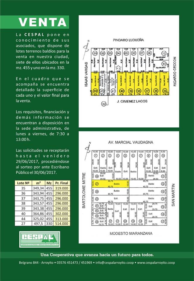 La Cooperativa de Electricidad y Servicios Públicos de Arroyito Limitada dispone, para la venta, de ocho lotes en terrenos baldíos en nuestra ciudad. Siete de estos inmuebles se encuentran ubicados en la manzana 455 y uno está situado en la manzana 330. En el siguiente cuadro se detallan la superficie de cada uno y el valor final para la venta:
