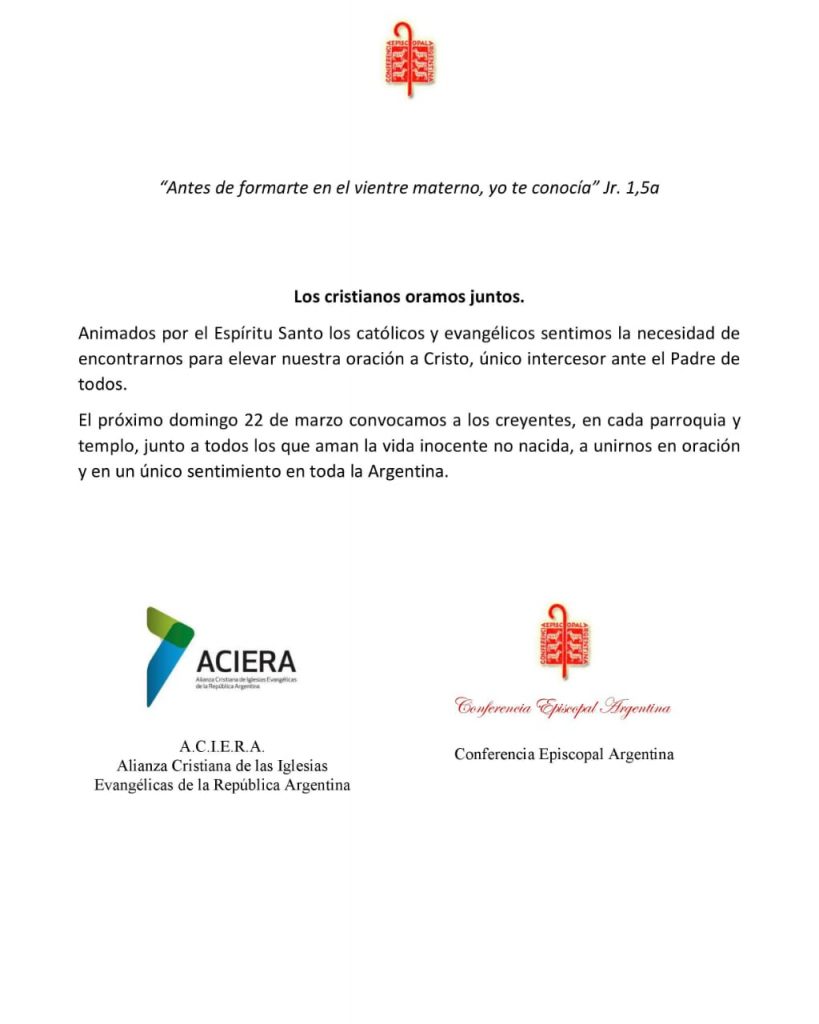 Las máximas autoridades del Episcopado y de las iglesias evangélicas se reunieron este martes y resolvieron convocar a una oración «a favor de las dos vidas» en cada de sus templos de todo el país.