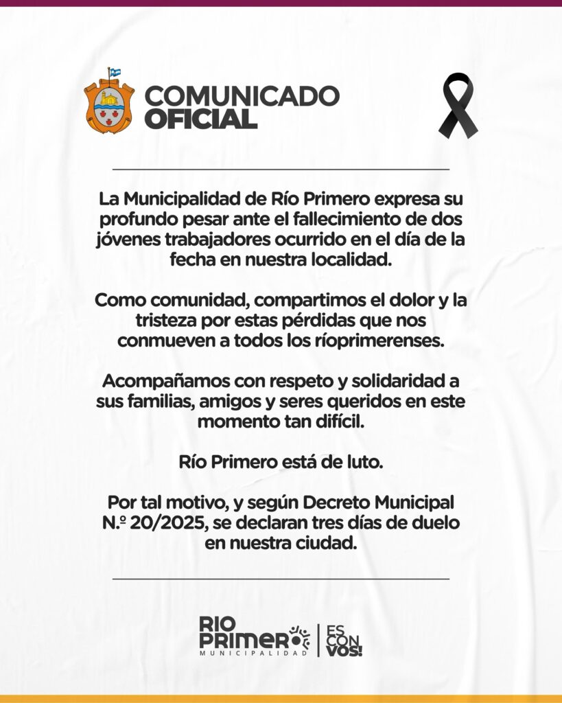La Municipalidad de Río Primero declara tres días de duelo por el fallecimiento de dos jóvenes A través de un