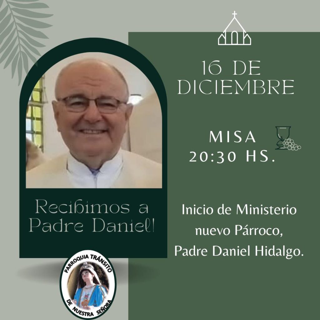 Tránsito: La Parroquia Tránsito de Nuestra Señora informó que el próximo 16 de diciembre, durante la misa de las 20:30 h, se realizará el inicio del ministerio del nuevo párroco, Padre Daniel Hidalgo.